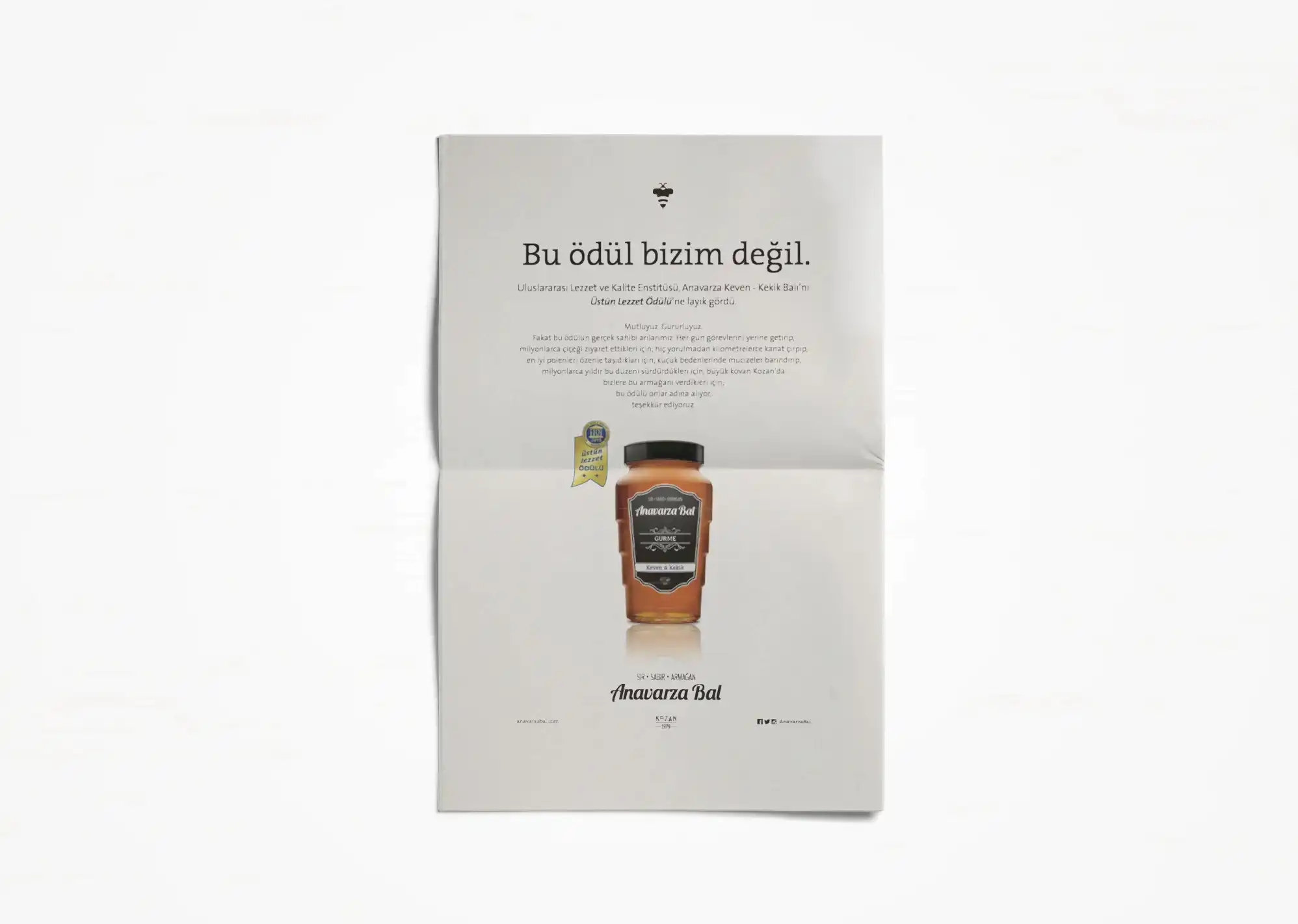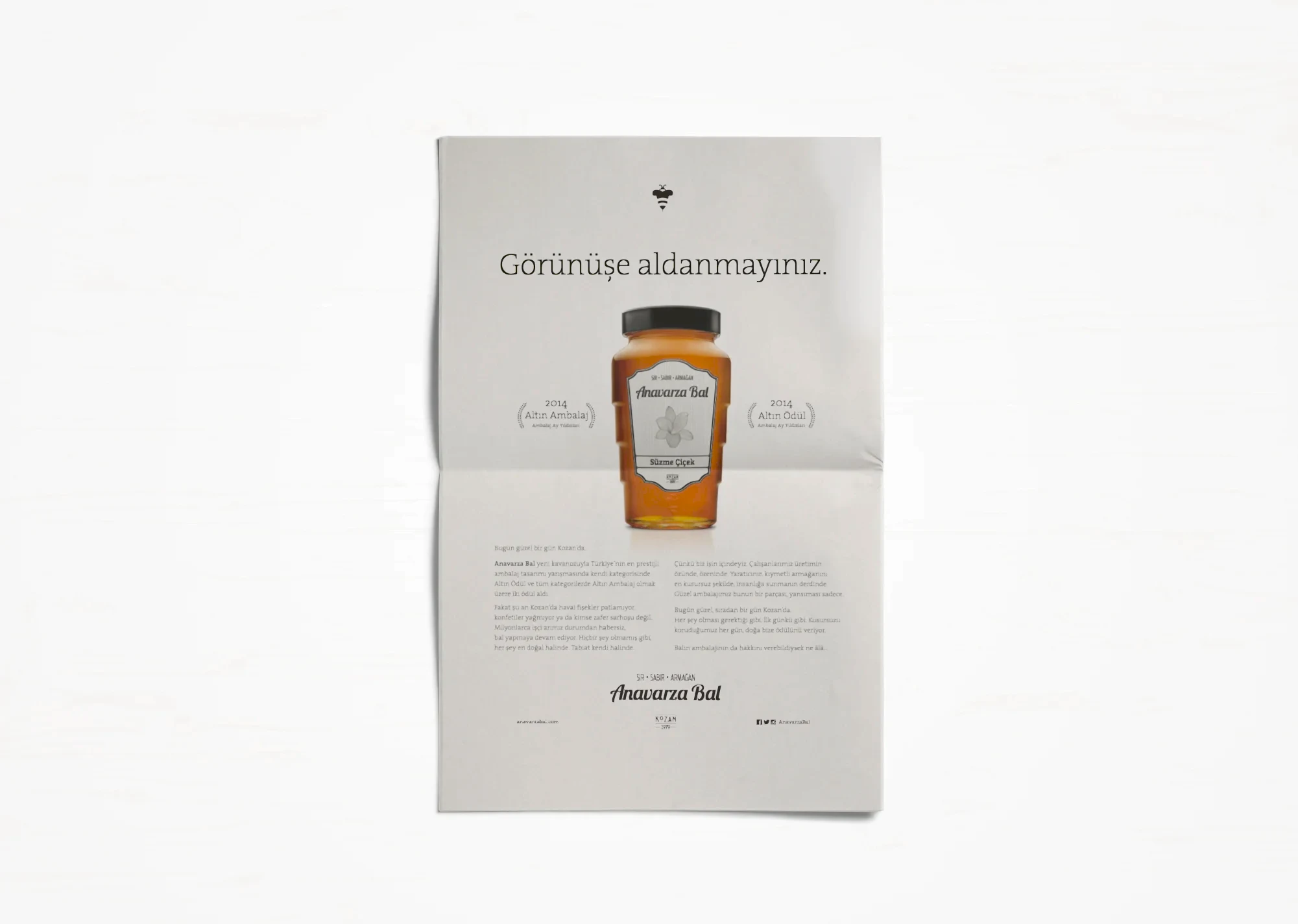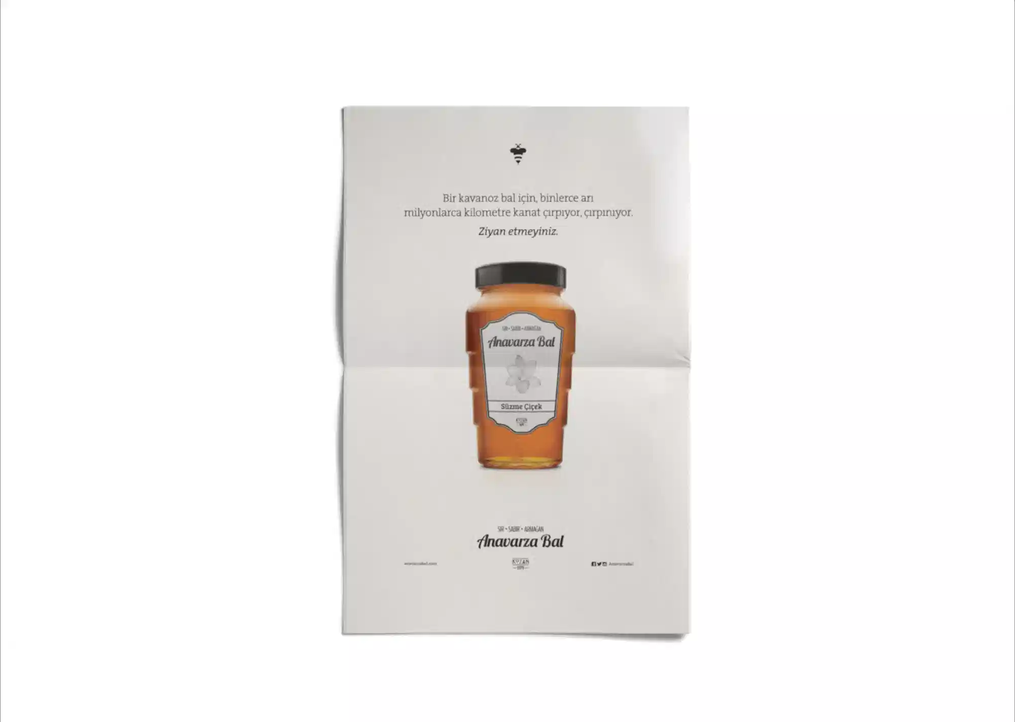 Uğrunda binlerce arının milyonlarca kilometre kanat çırptığı, arıcının toplamak için aylarca sabırla beklediği balın ziyan olmaması ve değerinin anlaşılması için kolları sıvadık. Arının üretim sürecini benimsediğimiz “sır, sabır, armağan” marka söylemi kimliğin tamamlayıcısı olarak geliştirildi. Arı’ya saygı duruşu fikriyle hazırlanan yeni logo ve görsel yaklaşımla da tüm iletişim malzemeleri yenilendi. Anavarza ambalajıyla ödüller kazandık ama aslında onun tasarımını biz yapmamış, doğadan almıştık.