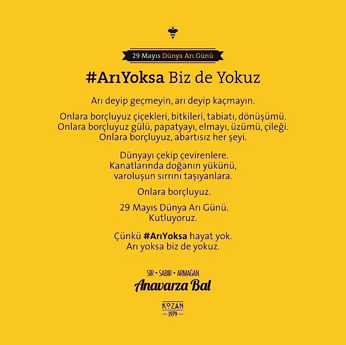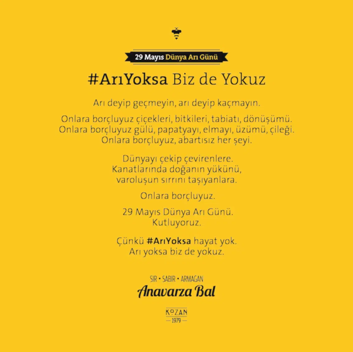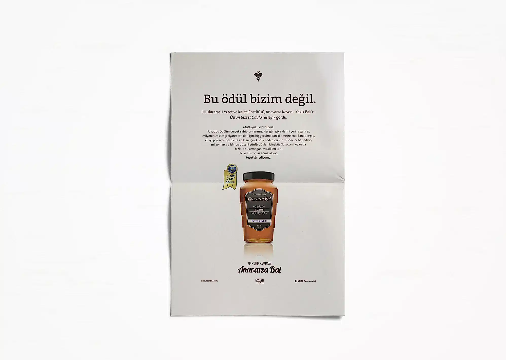 Uğrunda binlerce arının milyonlarca kilometre kanat çırptığı, arıcının toplamak için aylarca sabırla beklediği balın ziyan olmaması ve değerinin anlaşılması için kolları sıvadık. Arının üretim sürecini benimsediğimiz “sır, sabır, armağan” marka söylemi kimliğin tamamlayıcısı olarak geliştirildi. Arı’ya saygı duruşu fikriyle hazırlanan yeni logo ve görsel yaklaşımla da tüm iletişim malzemeleri yenilendi. Anavarza ambalajıyla ödüller kazandık ama aslında onun tasarımını biz yapmamış, doğadan almıştık.