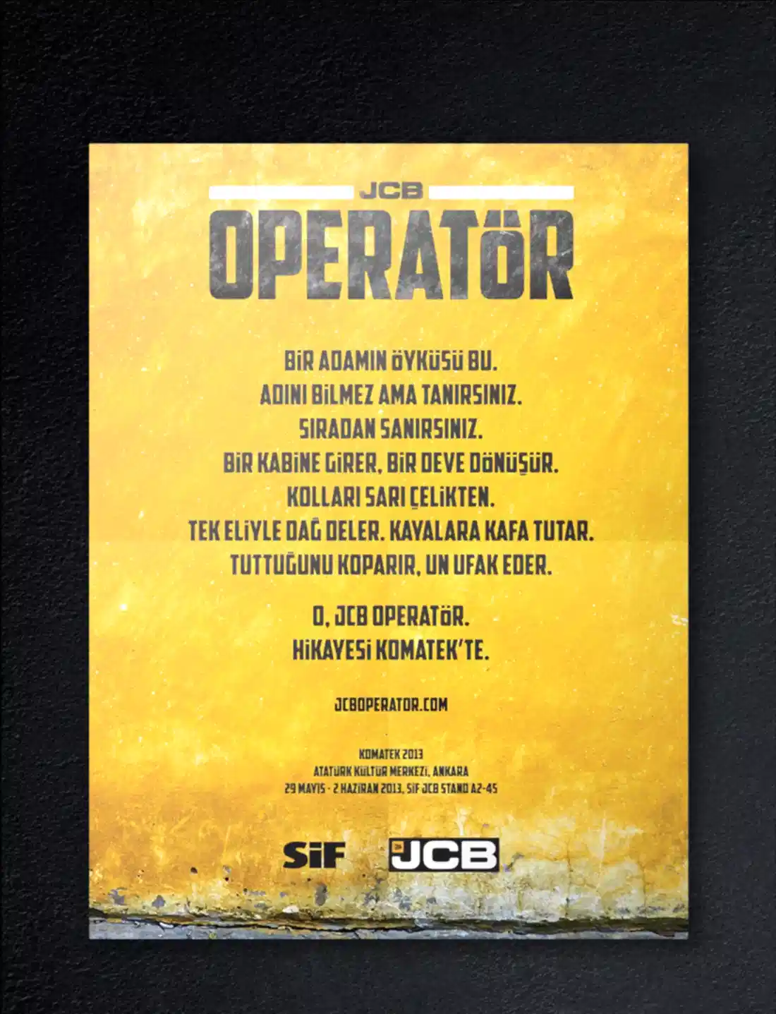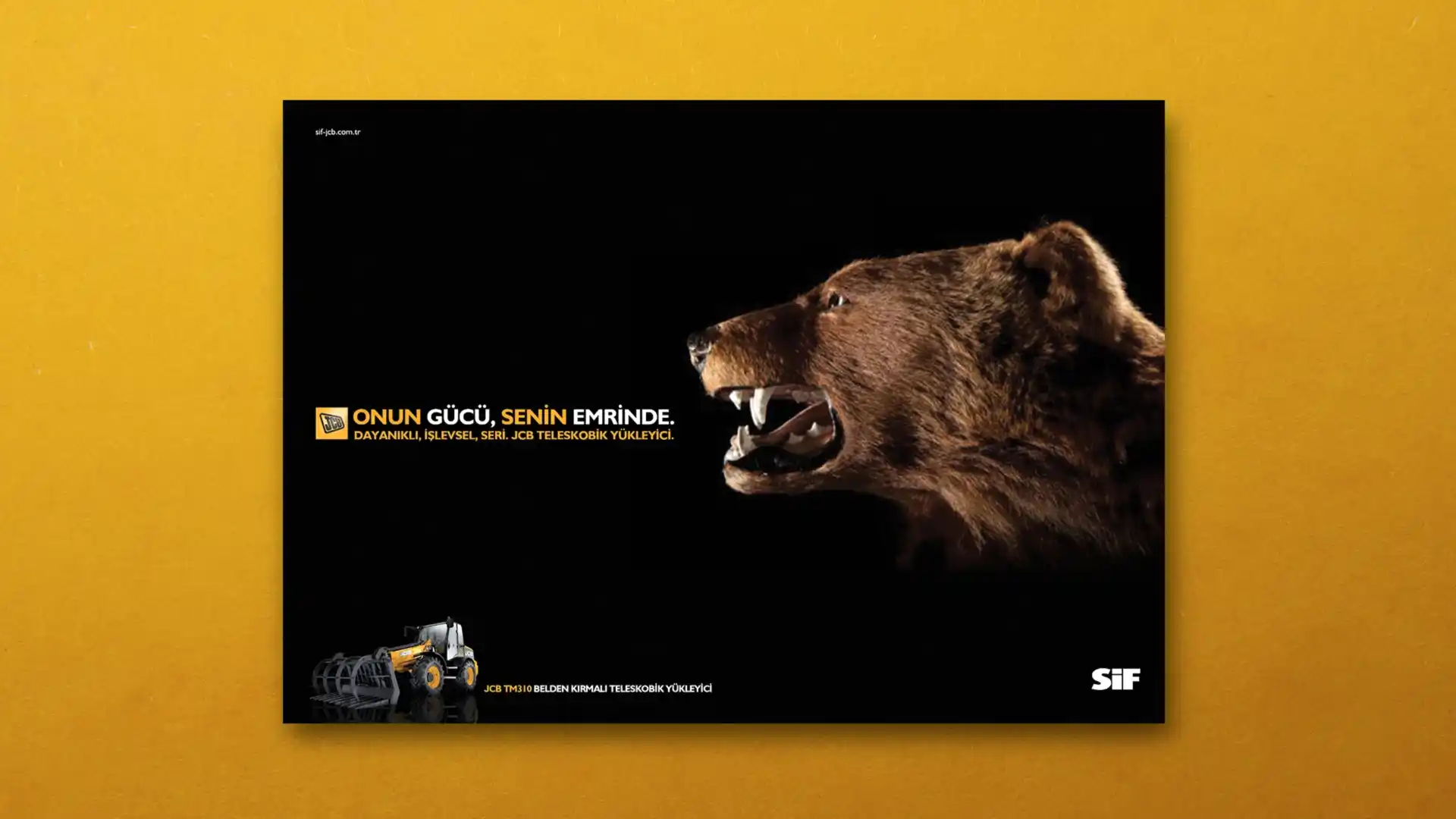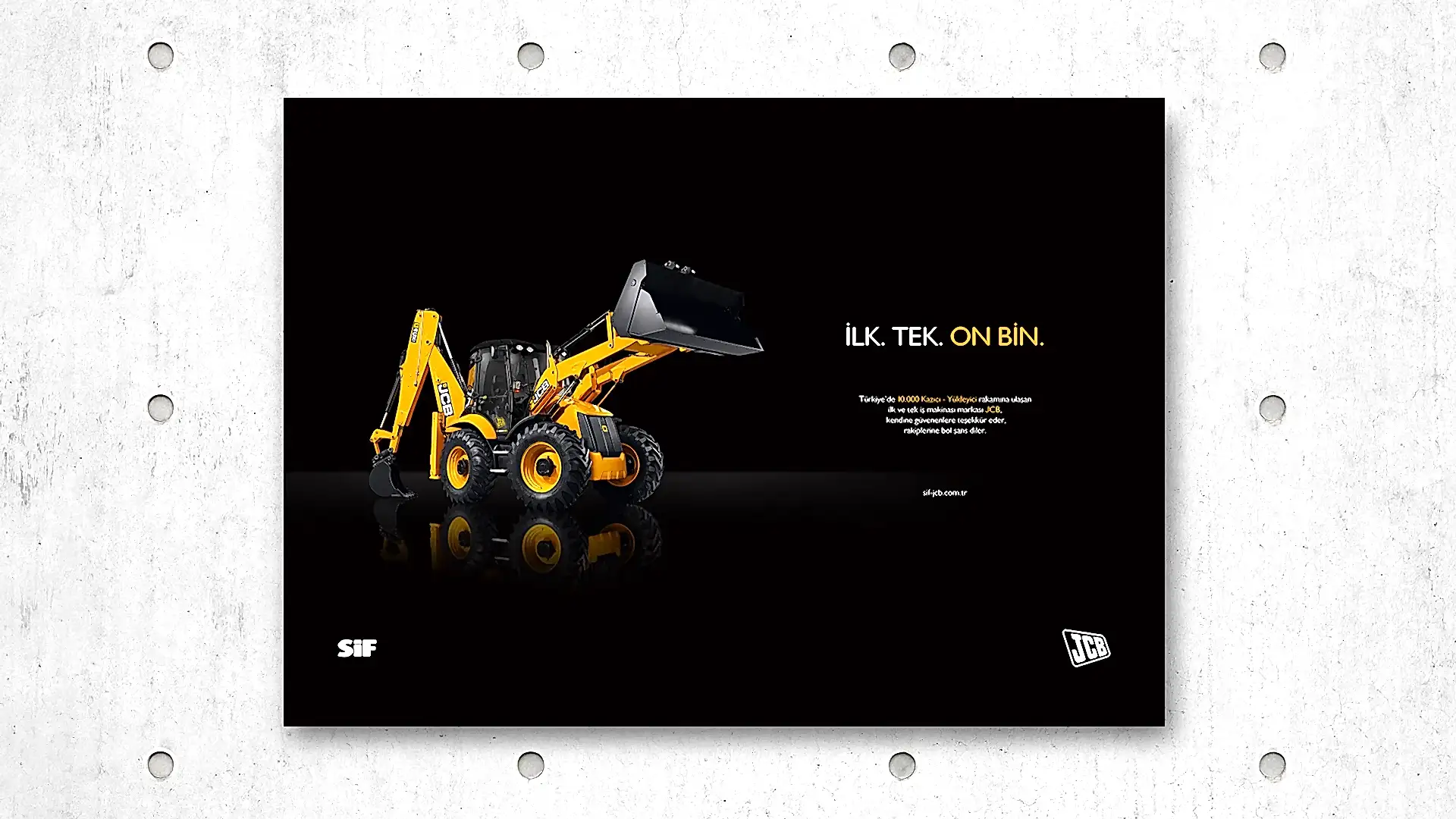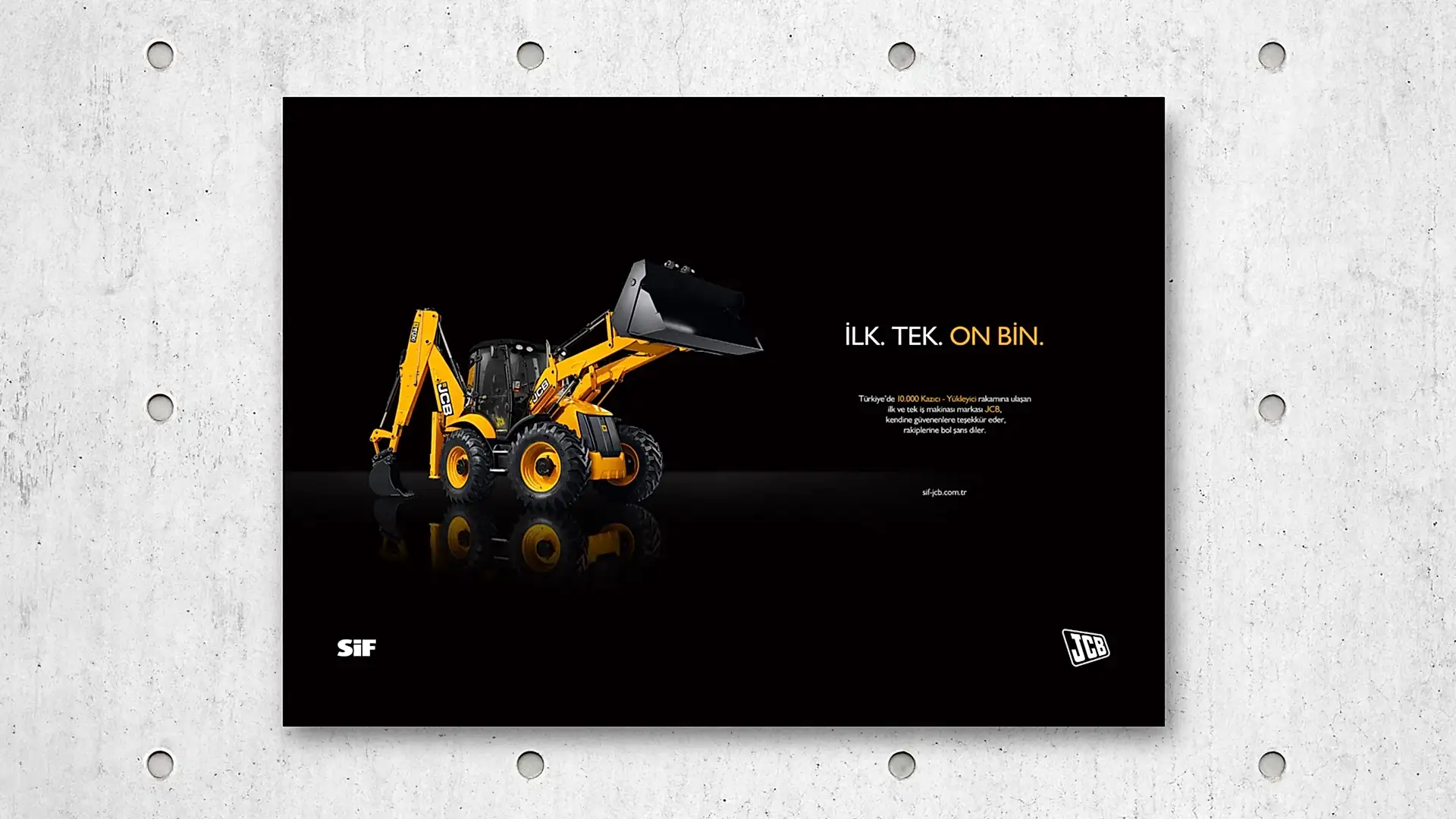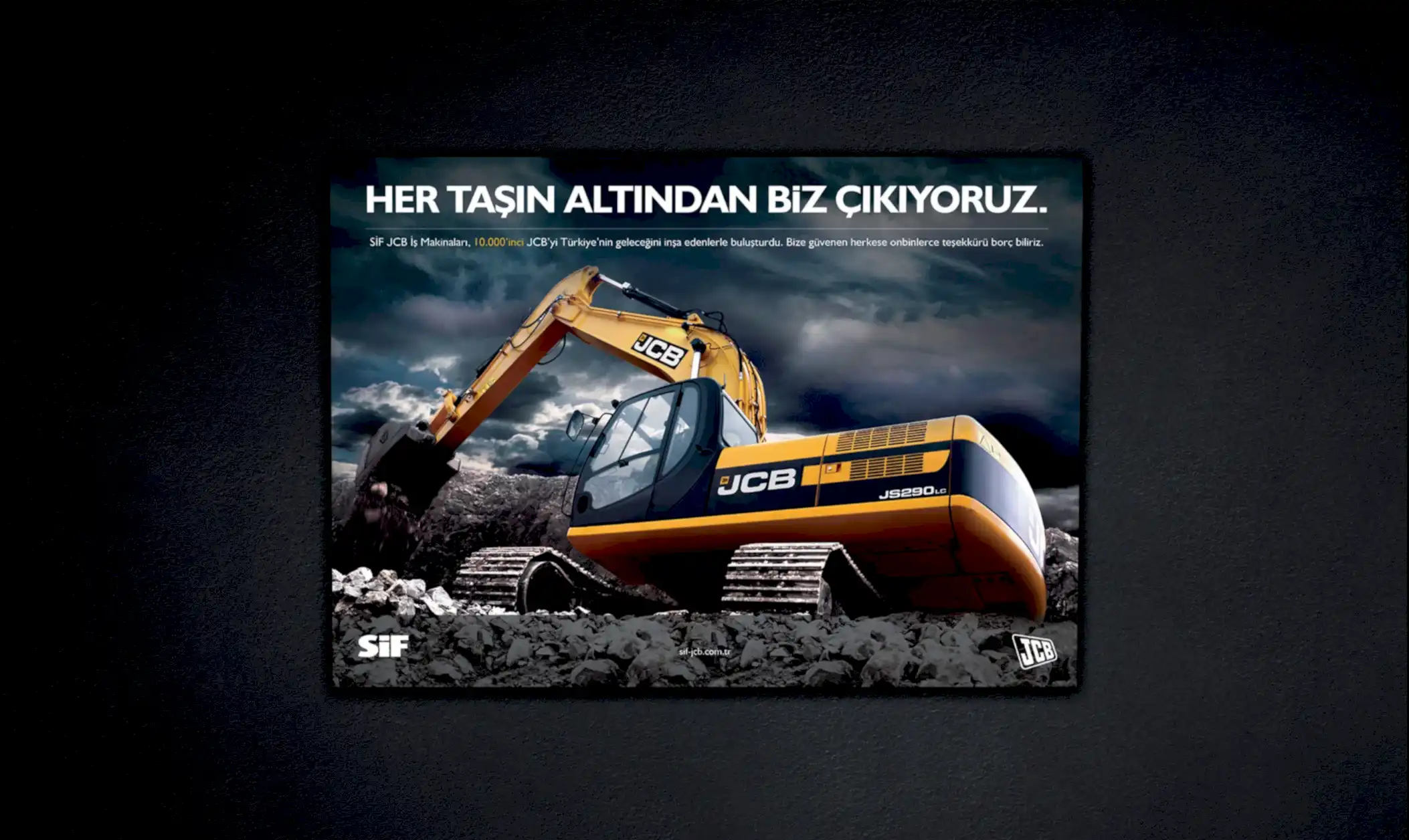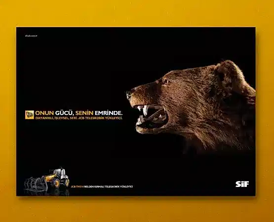 JCB ve Türkiye’deki dağıtımcısı SİF, sektöründe uzmanlıklarıyla bilinen, popüler ve köklü markalardı. Çok fazla söz söylemeye ihtiyaçları yoktu. Biz de o yüzden az söz içeren, SİF ve JCB’nin işbirliğini ön plana çıkaran ve yeni ürünlerinin en çarpıcı özelliklerini tanıtan bir kampanya hazırlayarak 5 sene sürecek bir etkili ajans-müşteri ilişkisinin temellerini attık.
