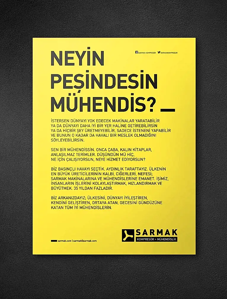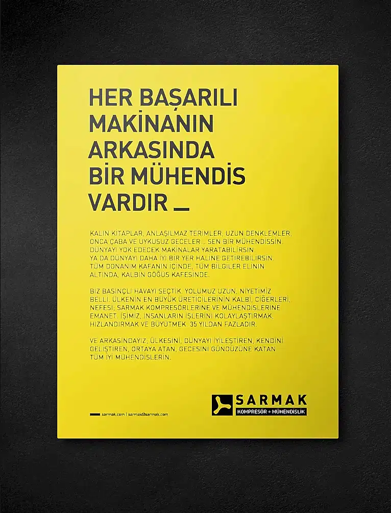 Sarmak’ı sektörün önemli oyuncularından biri haline getiren, müşteri ve tedarikçileriyle kurduğu güvene dayalı ilişkilerin yanı sıra eşine az rastlanır bir disiplinle mühendislik yapıyor olmalarıydı. Sarmak’ın yeni marka kimliği ‘Mühendis’ olduğunu mutlaka hissettirmeliydi.
